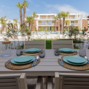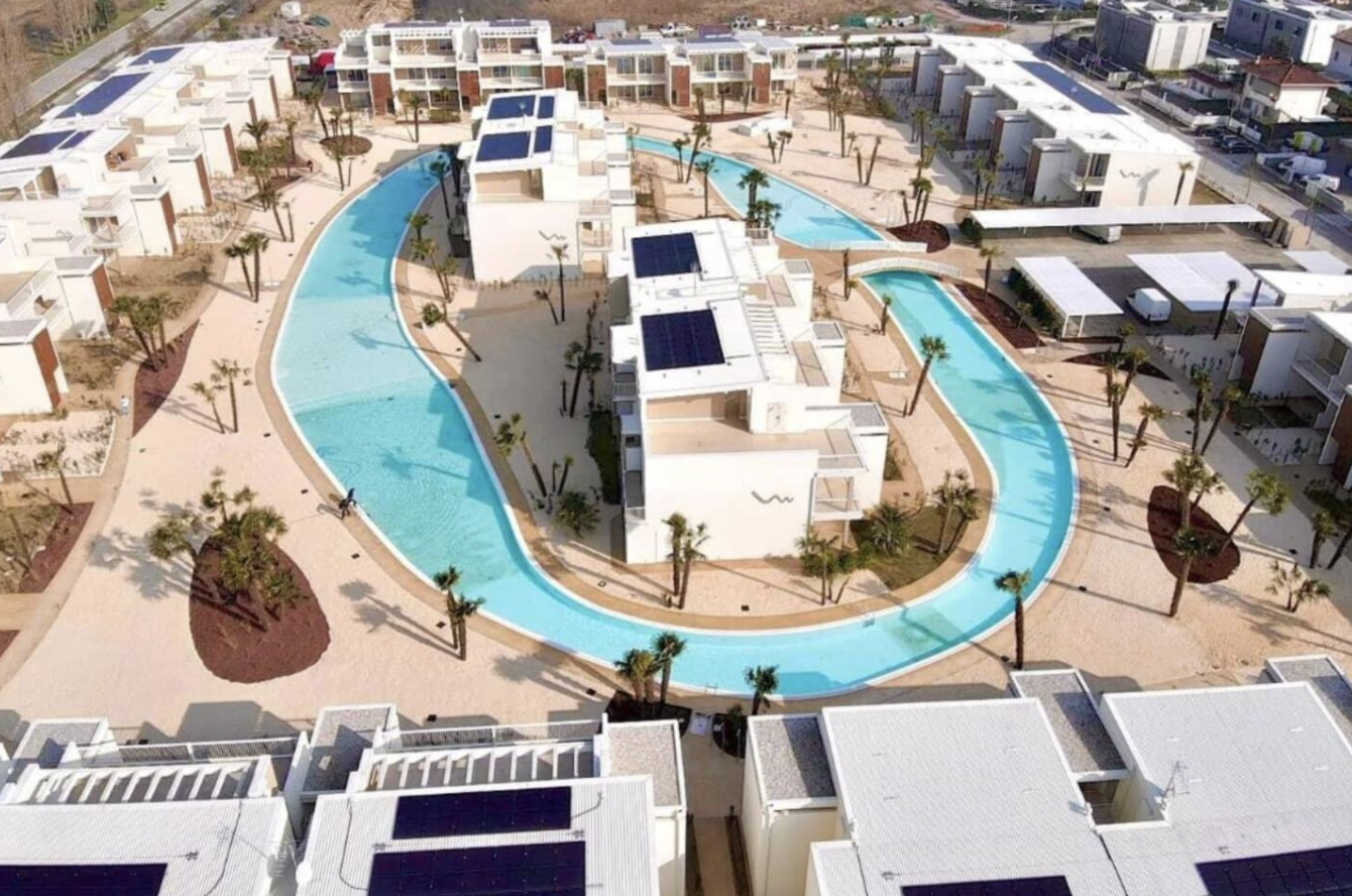 Appartamenti di lusso fronte piscina circolare in resort Wave Island Jesolo. Questa casa di nuova costruzione immersa in palme e sabbia bianca/rosa offre 2 camere moderne, balcone ampio per feste, finiture e arredi alta qualità, aria condizionata/riscaldamento. A 300mt mare, 5min Piazza Milano con ristoranti, bar, negozi, in stile glamour Dubai Marina.