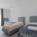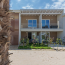 Due camere: matrimoniale principale, seconda per 3 persone con letti singoli. Bagno moderno con asciugacapelli e prodotti cortesia. Cucina attrezzata: macchina caffè, microonde, piano induzione, frigorifero, freezer, utensili completi. Soggiorno con smart TV ultima generazione, Wi-Fi super rapida. Giardino privato con tavolo, sedie, sdraio per pranzi all'aperto. Parcheggio privato garantito. Resort con piscina 2.000mq sabbia bianca, ombrelloni, sdraio. Ideale famiglie o gruppi per vacanze sceicche.