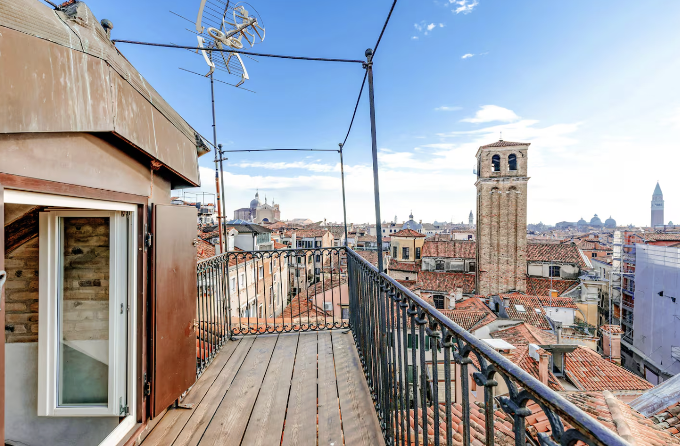 Appartamenti di lusso con terrazza altana a 360 gradi e vista mozzafiato su Venezia. Situato all'ultimo piano di palazzo storico in Cannaregio tranquilla, a 10 minuti dal Ponte di Rialto, questo appartamento offre privacy e comfort moderni immersi nell'autenticità veneziana, senza ascensore ma con servizio porter bagagli su richiesta. Ideale per coppie, famiglie o gruppi fino a 6 persone in cerca di esperienza esclusiva nel cuore della città.