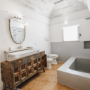 Nel trullo principale: camera matrimoniale con materasso premium, armadio, bagno interno autentico con vasca scavata nella pietra, grande lavabo e specchio; seconda camera matrimoniale con vista spettacolare sul tetto scolpito dall'interno, bagno adiacente con doccia, WC e lavabo; ingresso luminoso con due letti singoli aggiuntivi su richiesta; zona giorno con due divani comodi, camino, tavolo per cene intime; cucina attrezzata con frigorifero, freezer, piano cottura, microonde, lavastoviglie, pentole, posate, calici, macchina caffè. Possibilità altri 2 letti singoli per gruppi numerosi.